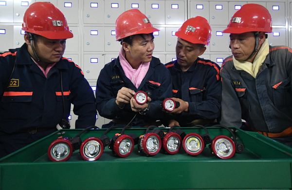 信湖煤礦職工在調(diào)試“智能礦燈”(蔣紅亮/攝)