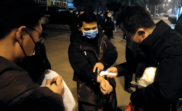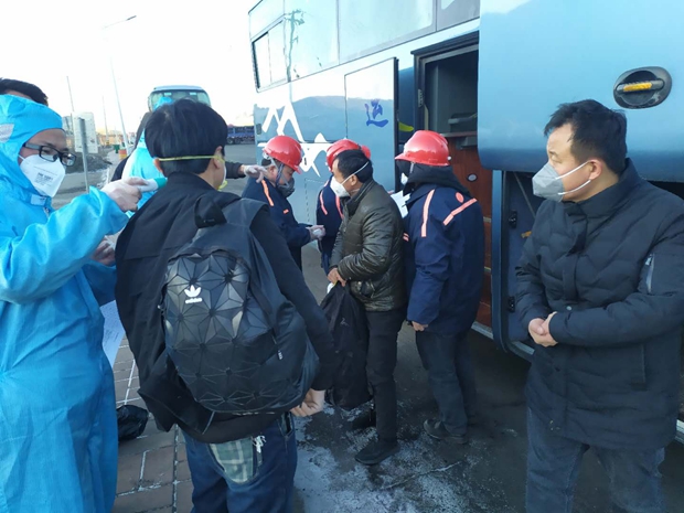 (2月13日,早上5點(diǎn)40時(shí),淮北市,工作人員在為即將“出征”的職工檢測體溫)
