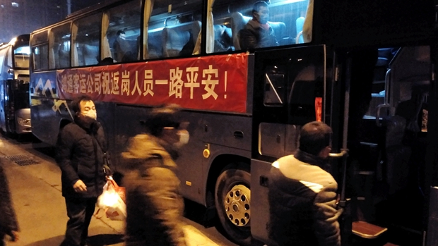 (2月13日,早上5點(diǎn)50時(shí),淮北市,職工們有序登車)