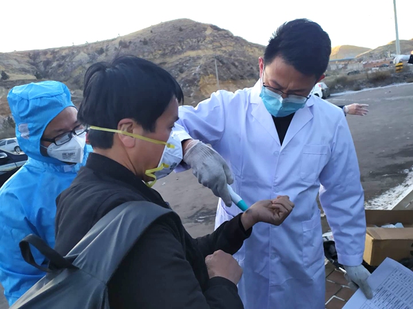 (2月14日,上午8點(diǎn)40分,鄂爾多斯市,范家村項(xiàng)目部防疫人員在為到崗職工檢測體溫)