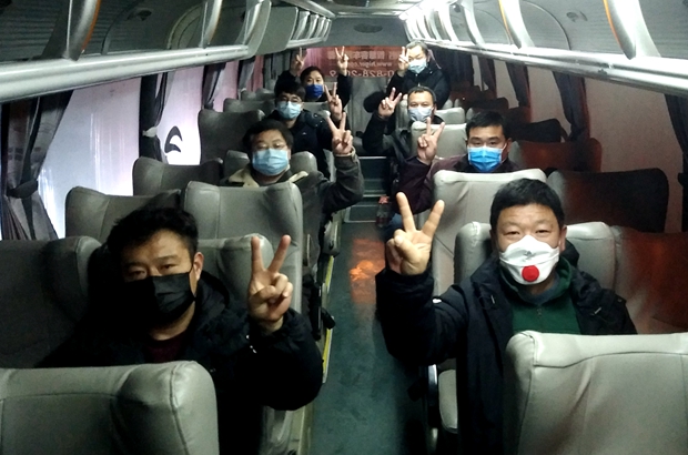 (2月13日,早上6點(diǎn),淮北市,即將“出征”的職工們在客車內(nèi)打出勝利手勢互相加油鼓勵(lì))