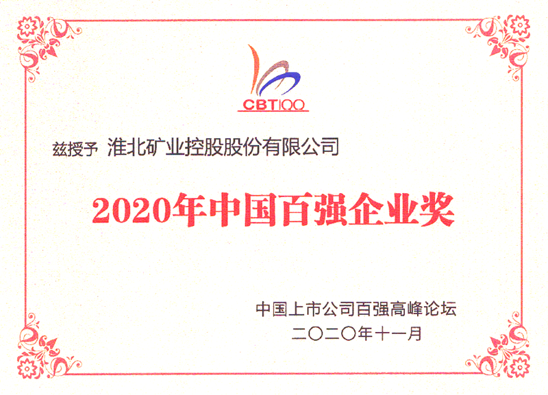 (2020年11月,中國(guó)上市公司百?gòu)?qiáng)高峰論壇授予淮北礦業(yè)控股股份有限公司“2020年中國(guó)百?gòu)?qiáng)企業(yè)獎(jiǎng)”)