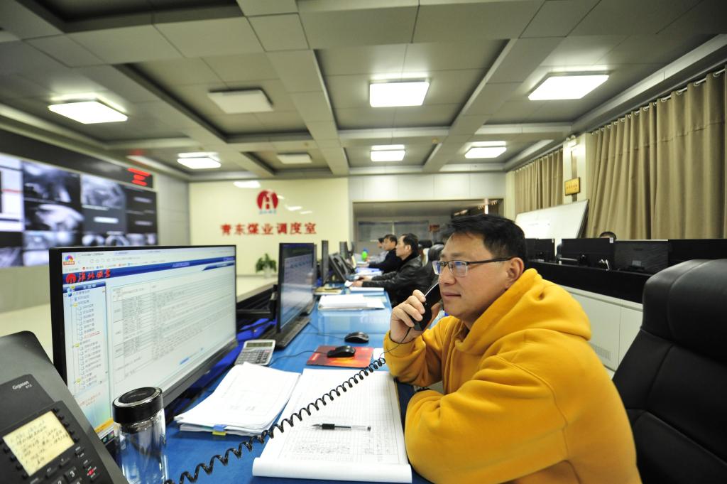 童亭礦調(diào)度指揮中心調(diào)度員目不轉(zhuǎn)睛的盯著調(diào)度大屏,調(diào)度指揮井下管理情況,并認(rèn)真做著記錄。