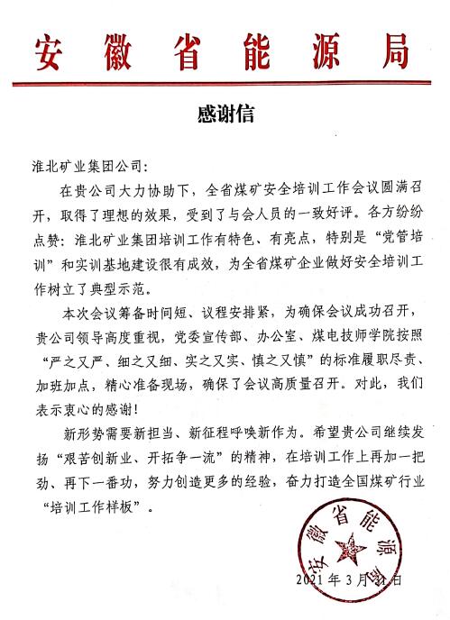 3月30日,由安徽省能源局組織召開,淮北礦業(yè)集團(tuán)承辦的全省煤礦安全培訓(xùn)工作會議圓滿結(jié)束。本次會議籌備時間短、議程安排緊,為確保會議成功召開,淮北礦業(yè)集團(tuán)領(lǐng)導(dǎo)高度重視,黨委宣傳部、辦公室、煤電技師學(xué)院按照“嚴(yán)之又嚴(yán)、細(xì)之又細(xì)、實之又實、慎之又慎”的標(biāo)準(zhǔn)履職盡責(zé)、加班加點,精心準(zhǔn)備現(xiàn)場,確保了會議高質(zhì)量召開。對此,省能源局專門發(fā)來感謝信,全文如下: