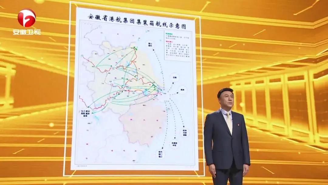 我今天帶來了一張港航集團(tuán)集裝箱航線示意圖。大家通過圖片可以看到:長江淮河顯示分明,航線交錯(cuò)有序。但是在港航集團(tuán)成立之前,我省港航資源分散、港口各自為政、航運(yùn)不成體系,貨物等船時(shí)間久,拖慢經(jīng)濟(jì)發(fā)展速度。