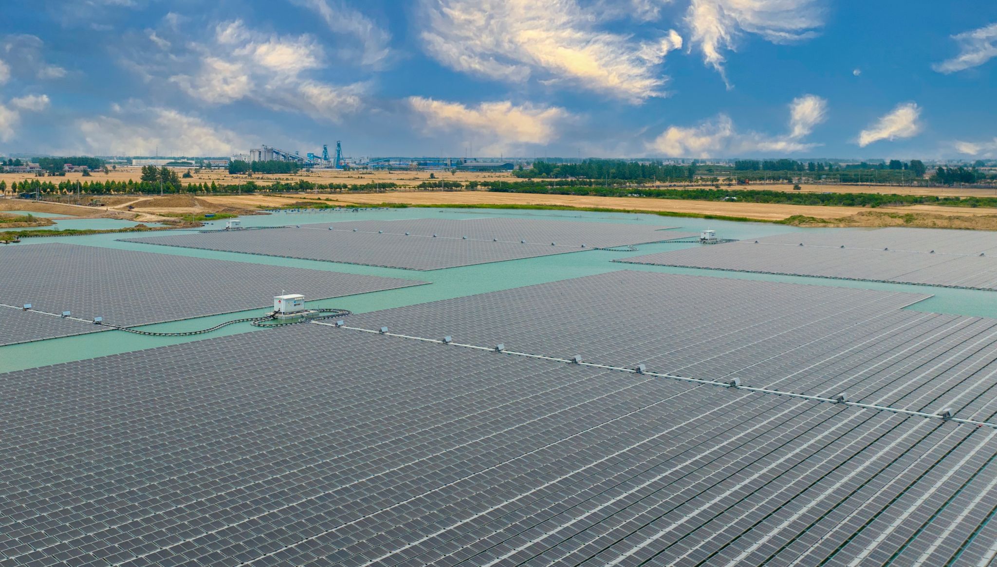 昔日的采煤沉陷區(qū),如今鋪滿藍(lán)色光伏板。孫疃32兆瓦、青東28兆瓦、袁一90兆瓦水面光伏電站,每年生產(chǎn)綠電1.6億千瓦時,節(jié)省標(biāo)煤約5.09萬噸,年減少二氧化碳排放13.74萬噸。
