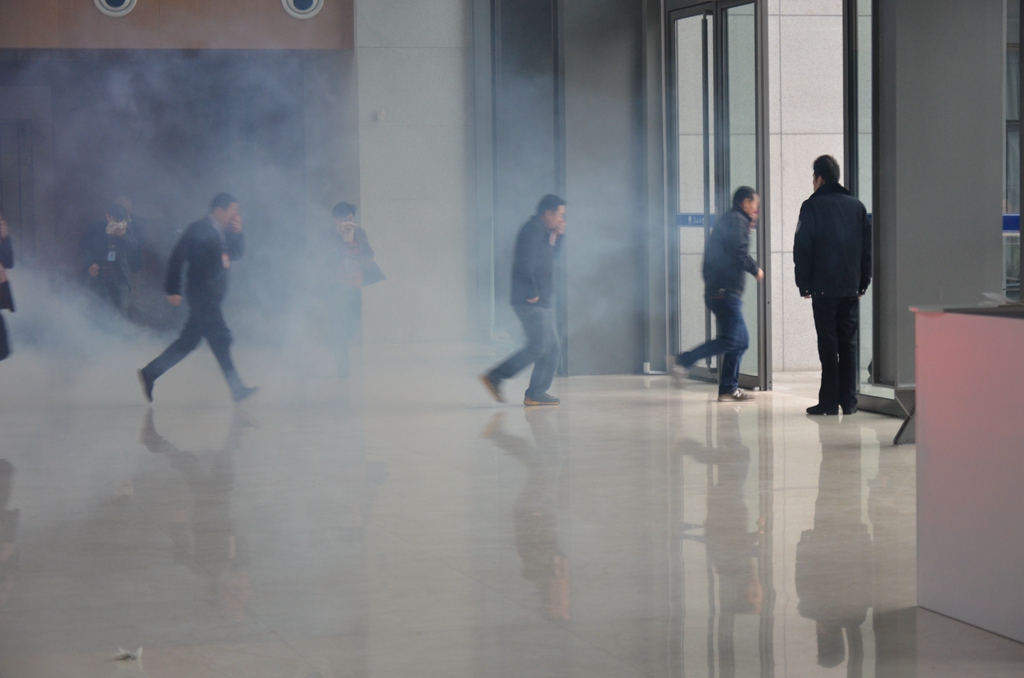 這次消防疏散演習由淮北礦業(yè)防火委舉辦,模擬辦公中心某樓層著火之后,大樓內應急廣播、火災報警、防火卷簾、排煙風機、客運電梯等設施設備實時聯(lián)動啟動?;馂膱缶螅邢乐ш?、淮北礦業(yè)救護消防大隊及時組織滅火,淮北礦業(yè)職防院醫(yī)護人員及時趕到組織救援的情況。入駐辦公中心的34家單位1040人參加了演習,疏散用時9分20秒,消防設備運行正常。