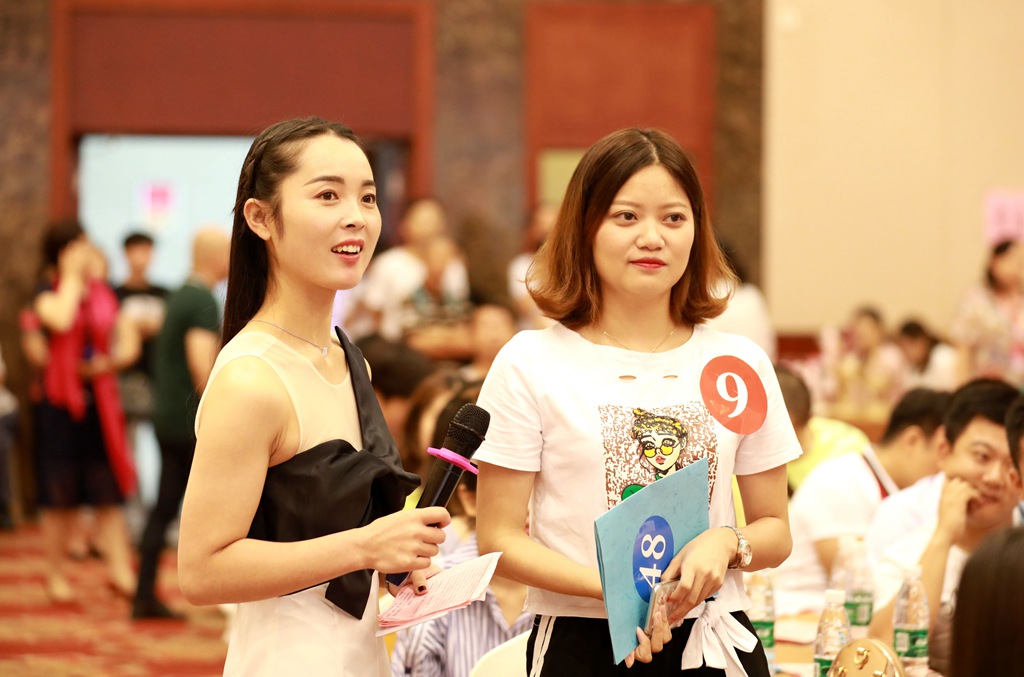 上午9:00,活動正式開始。首先進行的環(huán)節(jié)是“初結良緣”,工作人員給每個人發(fā)了一個數(shù)字號牌,大家把號牌上的數(shù)字稱為“緣分的編號”。女嘉賓分幾輪先后走到舞臺上,與臺下男生面對面,臺下男生認為和誰最有“眼緣”,就會走上臺去,把自己手中的數(shù)字牌貼到女生身上。11號女嘉賓于曉霜獲得6票,成為了現(xiàn)場的“人氣女生”。