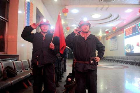 春節(jié)放假留守入井人員進(jìn)行入井前的安全確認(rèn)。入井職工個(gè)個(gè)精神抖擻,鏗鏘有力的安全確認(rèn)聲久久回蕩在候罐大廳。(王文東)