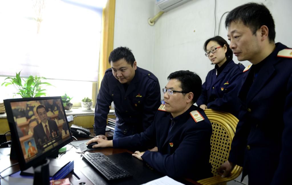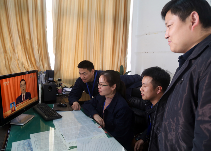 3月5日上午,備受矚目的中華人民共和國第十三屆全國人民代表大會第二次會議隆重開幕。電力分公司各部門在工作忙碌之暇第一時間組織人員通過網(wǎng)站、手機客戶端、電視等多種方式觀看大會直播盛況。圖為幾名工作人員正在認(rèn)真聽取總理李克強代表國務(wù)院向大會作政府工作報告。(謝宇)