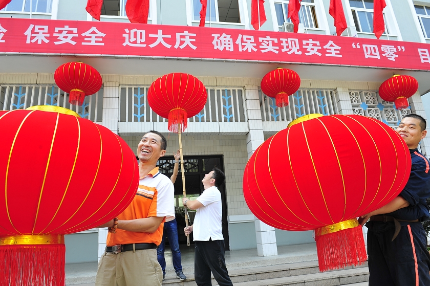 新中國成立70周年之際,朔石礦業(yè)在工業(yè)廣場、主要道路等場所懸掛大紅燈籠、五星紅旗,營造濃厚的節(jié)日喜慶氛圍。圖為該公司職工滿懷喜悅心情張燈結(jié)彩,抒發(fā)愛國情懷。(喬時(shí)慶)