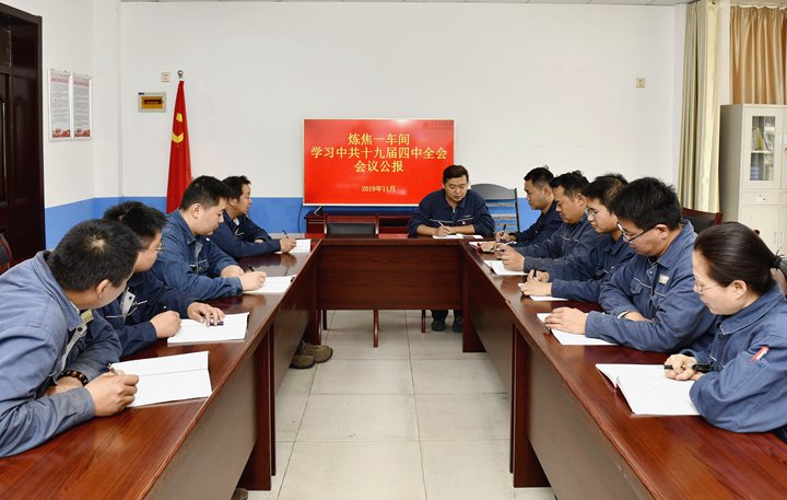 11月1日,臨渙焦化公司煉焦一車間黨支部組織黨員認(rèn)真學(xué)習(xí)中國共產(chǎn)黨第十九屆中央委員會(huì)第四次全體會(huì)議公報(bào)。當(dāng)日,該公司黨委發(fā)出通知,要求各黨支部結(jié)合實(shí)際,組織黨員認(rèn)真學(xué)習(xí)宣傳貫徹會(huì)議精神,為推進(jìn)國家治理體系和治理能力現(xiàn)代化作出自己應(yīng)有的貢獻(xiàn)。(王明明 攝)