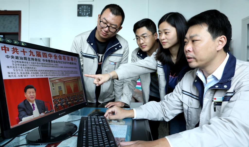 11月1日,童亭礦黨群工作部人員通過電腦、手機(jī)客戶端觀看中國共產(chǎn)黨第十九屆中央委員會(huì)第四次全體會(huì)議公報(bào)。(高加林 攝)