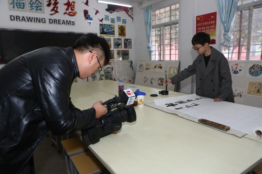 11月22日,安徽電視臺《藝術人物》欄目組走進桃園礦學校,為在第十六屆《德藝雙馨》中國文化展示活動中,被評為安徽省書畫形象代言人的該校八年級學生相博涵送來喜報,并進行專題采訪。