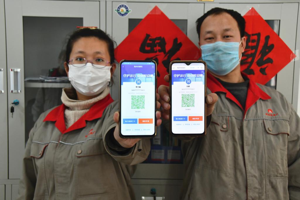 3月5日,臨渙選煤廠兩名職工在展示申領(lǐng)的健康狀況綠色“安康碼”信息。該廠在全廠推行“皖事通”APP安康碼“綠碼通行”,即實(shí)行體溫檢測(cè)合格+“綠碼通行”疫情防控新模式,避免了測(cè)量體溫人員排隊(duì)近距離信息篩查,提高了健康狀況信息掌握和降低了安全風(fēng)險(xiǎn)。