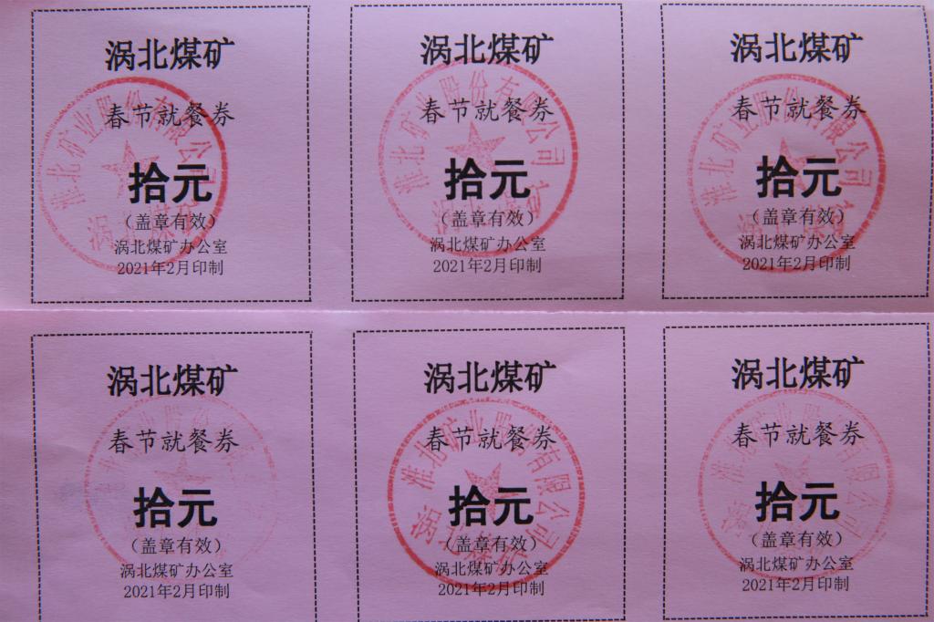 今年春節(jié),渦北礦為全力做好防疫情、保安全、穩(wěn)出勤等工作,在春節(jié)放假期間按照每天30元/人次,向留守職工發(fā)放春節(jié)就餐券,使職工在礦上樂享濃濃的年味。