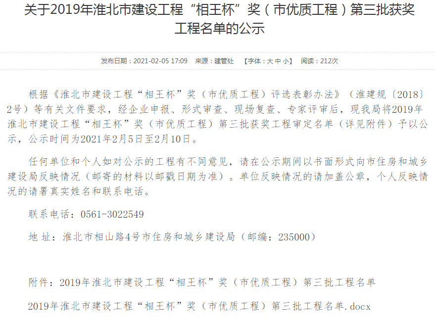 日前,淮北市住房和城鄉(xiāng)建設(shè)局公布了2019年淮北市建設(shè)工程“相王杯”獎(jiǎng)(市優(yōu)質(zhì)工程)獲獎(jiǎng)工程公示名單,由工程建設(shè)公司承建的淮北礦業(yè)股份有限公司臨渙選煤廠西區(qū)新增精煤倉工程、桓湖花園(南側(cè)地塊)10#-19#及2#地下車庫、安徽口子酒業(yè)股份有限公司退城進(jìn)區(qū)搬遷項(xiàng)目 1#—5#制曲大樓等三項(xiàng)工程同時(shí)在列,成為獲獎(jiǎng)數(shù)量最多的施工單位。