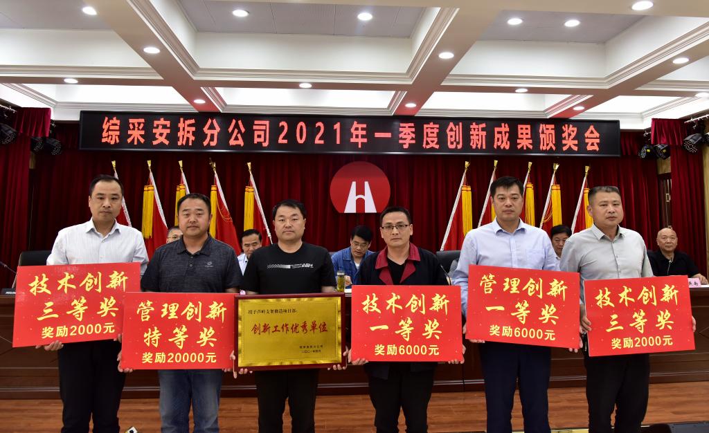 5月26日,綜采安拆分公司舉行2021年一季度科技創(chuàng)新成果表彰頒獎會,對4項管理創(chuàng)新成果、11項技術(shù)創(chuàng)新成果以及創(chuàng)新工作優(yōu)秀單位給予500元至20000元不等的獎勵。