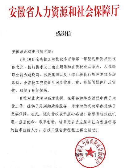 9月14日,安徽省人力資源和社會(huì)保障廳給淮北煤電技師學(xué)院發(fā)來感謝信,感謝該學(xué)院在全省技工院校2021年秋季開學(xué)第一課暨迎世賽主題活動(dòng)中給予的大力支持。