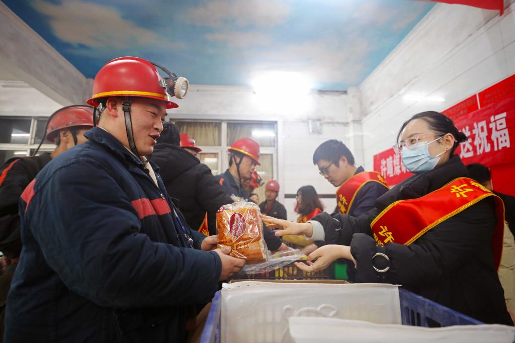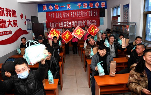 1月25日中午,許疃礦副井口,一句句安全祝福和囑托,吸引了剛上下班的職工們停住腳步。一群年輕的志愿者,一邊叮囑大家上班注意安全,一邊為大家送上面包、牛奶、蘋果、八寶粥和美好的新春祝愿。
