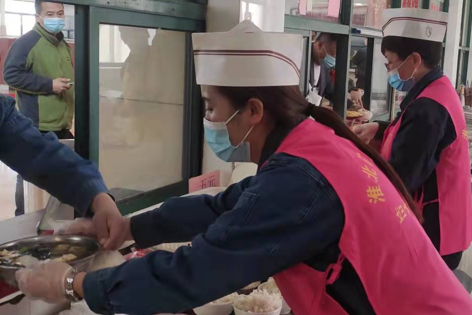 4月2日一大早,在職工食堂售賣大廳,面對前來就餐的職工,臨渙礦機電科機廠婦女協(xié)安員劉珍笑臉相迎,熱情的給工友們打飯遞餐。由于礦井實行封閉管理,再加上附近村鎮(zhèn)居住的職工全部搬入礦內居住,職工食堂服務人員“吃緊”。為此,礦工會、婦女協(xié)安會組織了22名協(xié)安員,分成三班,義務到職工食堂幫忙,變身服務員,熱情為職工提供就餐服務。