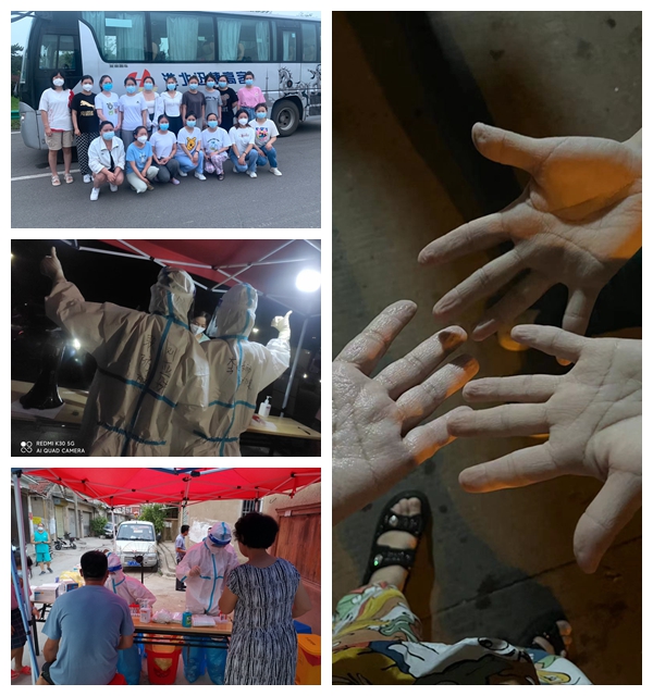 到達懷遠后,檢測隊員便與病毒賽跑,爭分奪秒進行核酸樣本采集。在高溫酷暑下,穿著密不透風的防護服,不能喝水,不能吃東西,不能上洗手間,臉被口罩勒出道道痕跡,衣服被汗水浸濕,手指變的皺白,但她們從未叫過一聲苦、一聲累。連續(xù)三天,當天核酸樣本采集結(jié)束,當天趕回淮北的隔離酒店。面對疫情,她們時刻準備著沖鋒,用自己的腳步和身影筑起抗擊疫情的堅固防線。