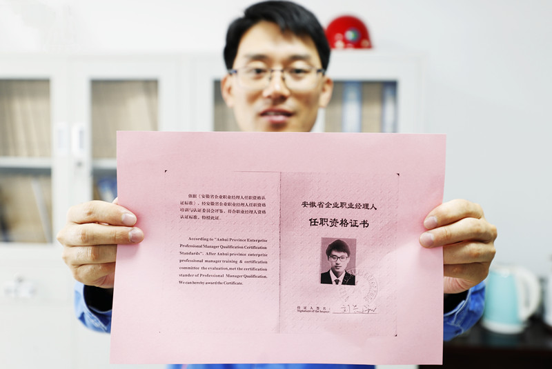 圖為工程管理部副部長劉先知出示《職業(yè)經(jīng)理人任職資格證書》