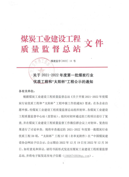 “太陽(yáng)杯”工程是煤炭行業(yè)建設(shè)工程質(zhì)量最高獎(jiǎng),有全國(guó)煤礦建設(shè)“奧斯卡”之稱。該獎(jiǎng)項(xiàng)由中國(guó)煤炭建設(shè)協(xié)會(huì)會(huì)同煤炭工業(yè)建設(shè)工程質(zhì)量監(jiān)督總站負(fù)責(zé)組織各有關(guān)質(zhì)量監(jiān)督中心站及有關(guān)專家進(jìn)行工程復(fù)查和評(píng)審工作,以把關(guān)嚴(yán)格、標(biāo)準(zhǔn)高著稱。