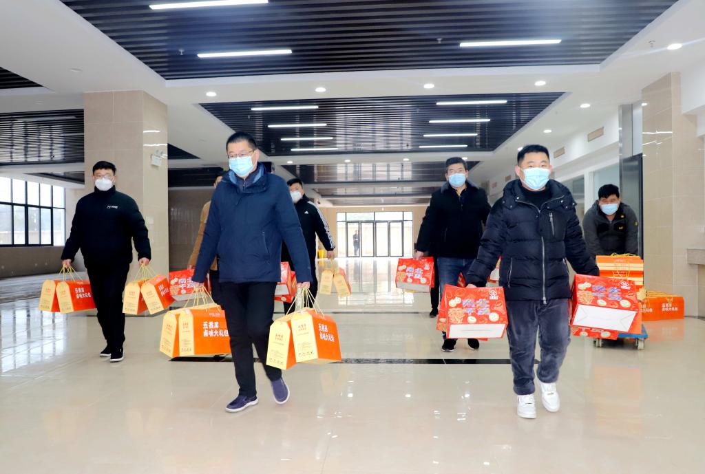 上午9時40分許,新綜合實訓(xùn)樓一樓大廳熱鬧非凡,該院領(lǐng)導(dǎo)在現(xiàn)場把一箱箱“南北干貨”、“鹵味大禮包”發(fā)放到教職工手中,送上學(xué)?!按蠹彝ァ钡年P(guān)懷和溫暖?!案兄x學(xué)校對我們員工的厚愛,新一年要在新征程上爭取更大的成績?!笔掷锬弥蠖Y包的教職工喜笑顏開。