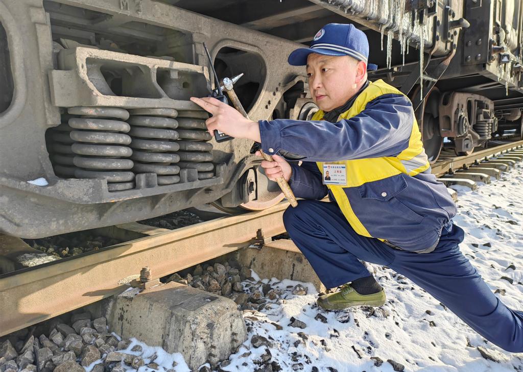 “檢車的時候大家注意腳下,防止滑倒摔傷。”薛勝杰向工友們交待了安全注意事項,一行人踩著積雪,向列車兩邊一字排開。列車停穩(wěn),薛勝杰把防護(hù)旗插好,紅色防護(hù)旗在陽光的照耀下顯得格外鮮艷、奪目;車體側(cè)梁下,冰柱垂垂,晶瑩剔透?!岸6.?dāng)當(dāng)”,一陣有力、動聽的敲擊聲不斷傳來。只見薛勝杰時而行走查看車輛配件有沒有缺損;時而鉆進(jìn)車底查看制動裝置、風(fēng)管是否漏泄;時而蹲下,用檢車錘敲打車輪,確認(rèn)踏面是否擦傷;時而又從車底爬出來,站起來,繼續(xù)往前走。筆者在現(xiàn)場看見,受空間限制,檢車員必須鉆進(jìn)車底才能完成風(fēng)管部位的檢查,非常不易。