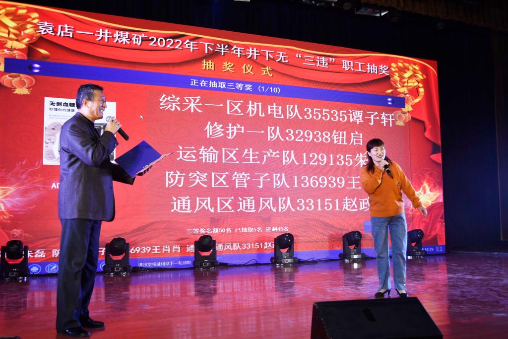 “袁店一礦的職工師傅們大家好,今年又見(jiàn)面了。我還是綜采一區(qū)職工詹鵬的家屬,目前家庭地位無(wú)可撼動(dòng)?!被顒?dòng)剛一拉開(kāi)帷幕,臺(tái)下眾人就被職工家屬王冬梅詼諧幽默的自我介紹引得哄堂大笑?!叭ツ晡壹艺铲i收入節(jié)節(jié)攀升,生活越來(lái)越好。在這里要感謝袁店一礦的領(lǐng)導(dǎo)和師傅們,沒(méi)有你們的正確引導(dǎo)和監(jiān)督愛(ài)護(hù),我們也不會(huì)如此幸福。下面我們開(kāi)始抽獎(jiǎng)......”