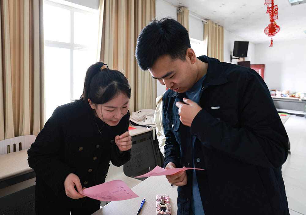 開場時,多數(shù)男女青年表現(xiàn)得較為羞澀、拘謹(jǐn)、放不開。在主持人有序地引導(dǎo)下,現(xiàn)場氣氛逐漸熱烈起來。在隨后的“圓圈介紹——猜猜我是誰”“旱地冰壺”“蒙面對對碰”“滑草狂嗨”“騎士與公主”等6項趣味互動中,男女青年輪番組隊、分合破立,不時擦出愛的火花。中途主持人還不斷與青年們互動,適時為游戲獲勝者發(fā)放獎品。