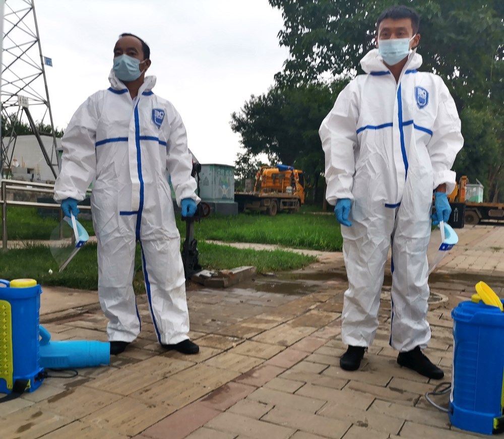 圖為王雷(左一)開(kāi)展災(zāi)后防疫消毒消殺