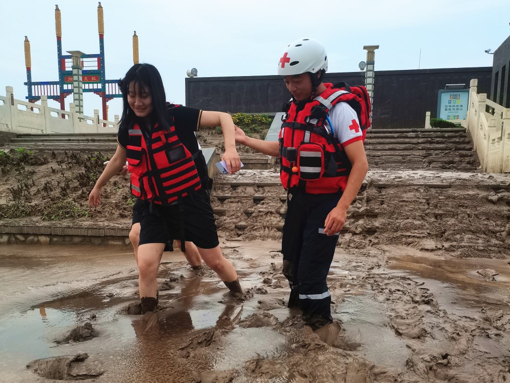 圖為王雷(右一)幫助受災(zāi)群眾轉(zhuǎn)移