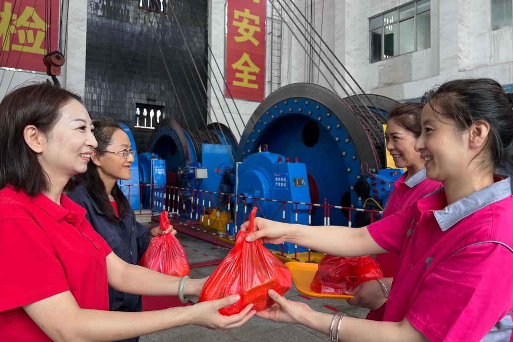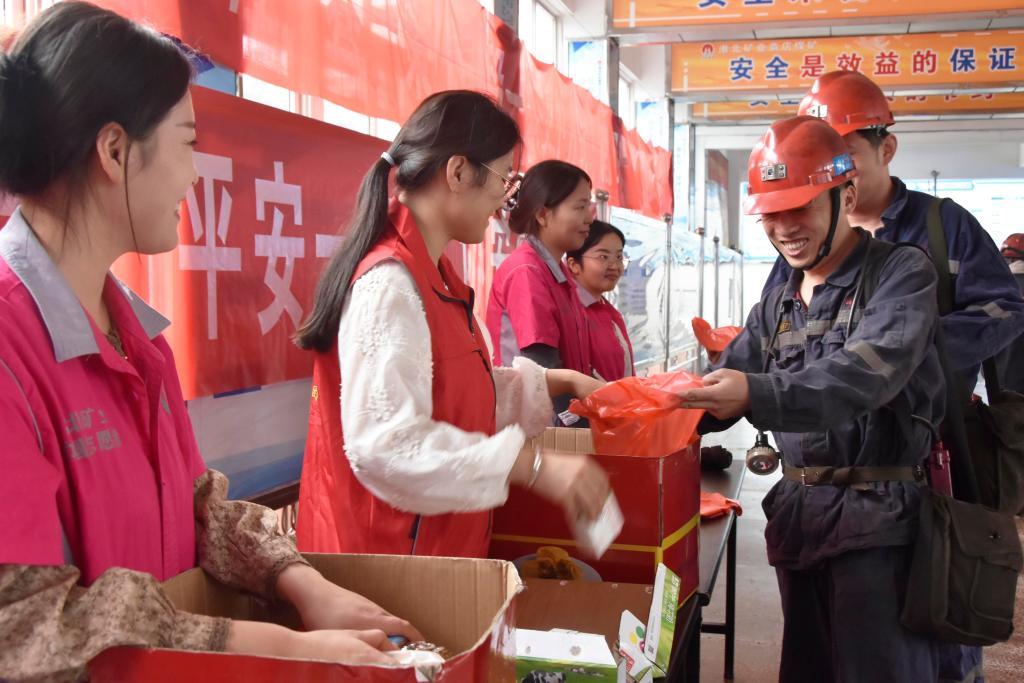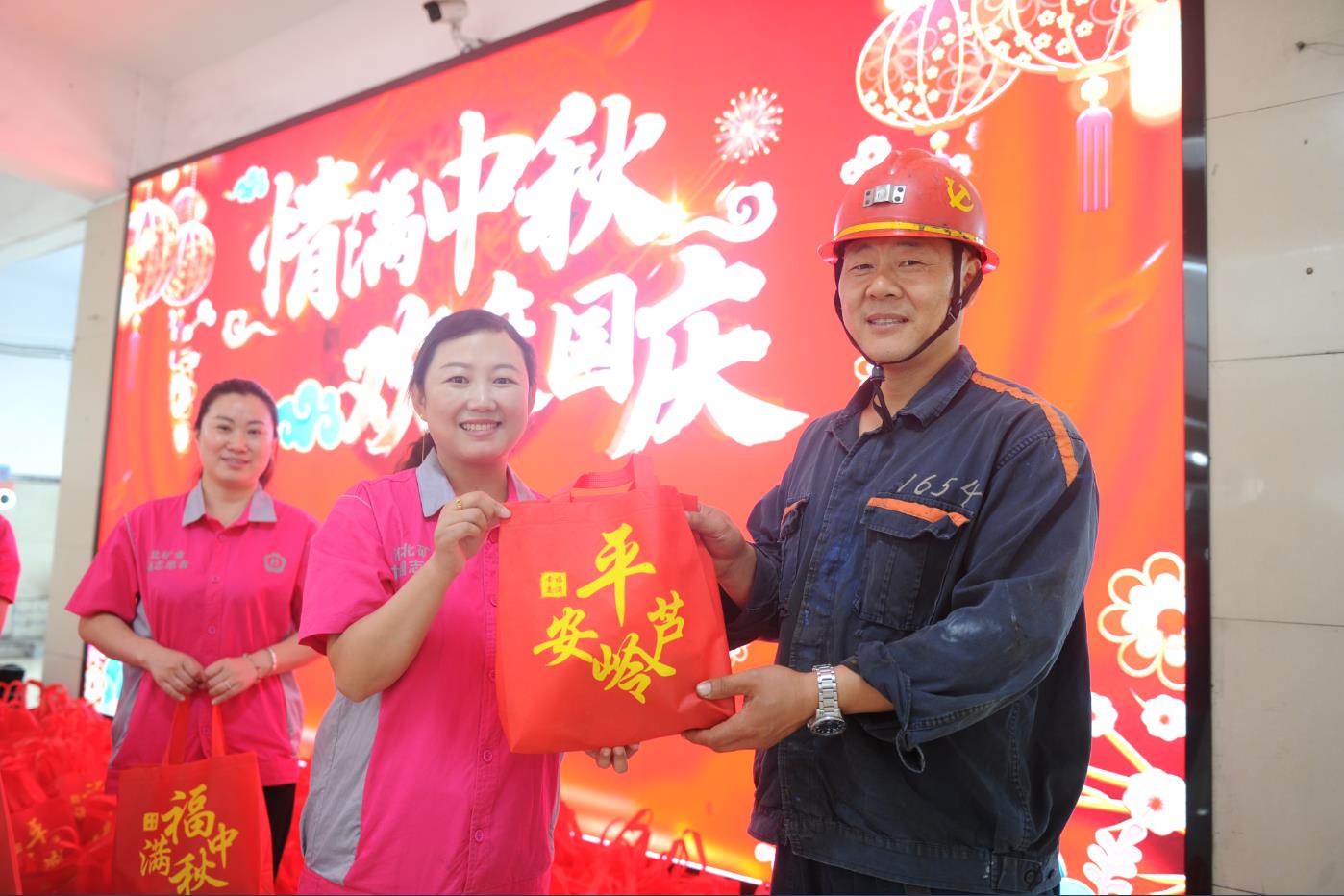 在該礦井口宣誓大廳,活動(dòng)現(xiàn)場(chǎng)氣氛熱烈溫暖。女工協(xié)安員們將裝著香甜可口的月餅、寓意平安的蘋果、綿軟可口的面包等食品的大禮包送到升入井的職工手中,將熱情的慰問、真摯的祝福和溫暖的叮囑送進(jìn)職工們心中,更加堅(jiān)定了大家安全生產(chǎn)的信心和決心。
