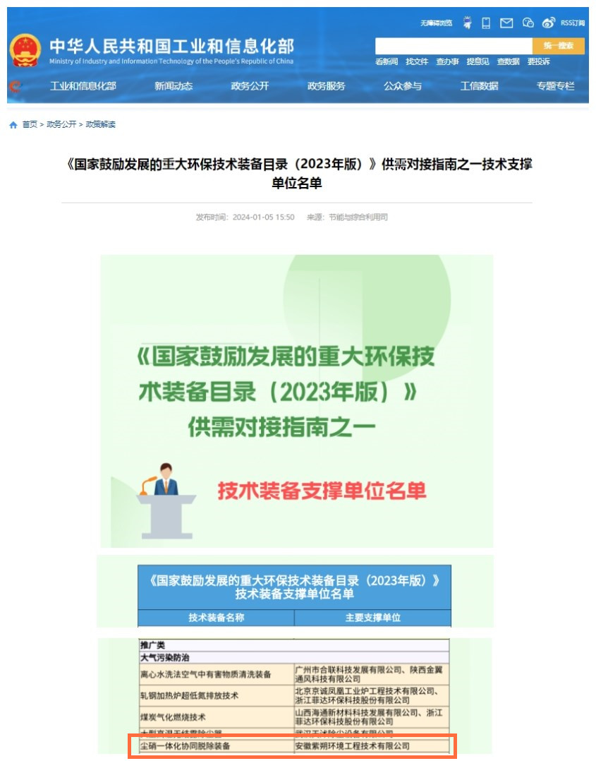 日前,由工業(yè)和信息化部聯(lián)合生態(tài)環(huán)境部公布的《國家鼓勵(lì)發(fā)展的重大環(huán)保技術(shù)裝備目錄(2023年版)》中,淮北礦業(yè)集團(tuán)紫朔環(huán)境公司“塵硝一體化協(xié)同脫除裝備”榮獲收錄。標(biāo)志著該公司在環(huán)保技術(shù)領(lǐng)域的顯著成就及其在大氣污染防治領(lǐng)域的專業(yè)地位。