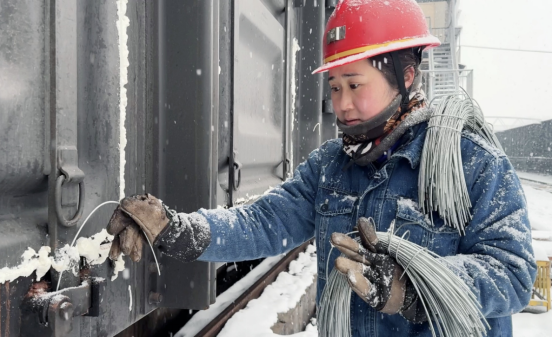 2月4日下午,記者走進(jìn)裝卸車間生產(chǎn)一線,捕捉在百米裝卸線上匆匆忙碌的身影,只見他們來(lái)回穿梭,時(shí)而傳出“咚咚”的敲擊聲。另外兩名女職工正在對(duì)車皮進(jìn)行加固,踩進(jìn)厚厚的積雪,腳上的棉鞋已浸濕大半,臉頰在寒風(fēng)中被凍得通紅,卻絲毫沒有影響到她們?nèi)褙炞⒌毓ぷ鳌?/p>