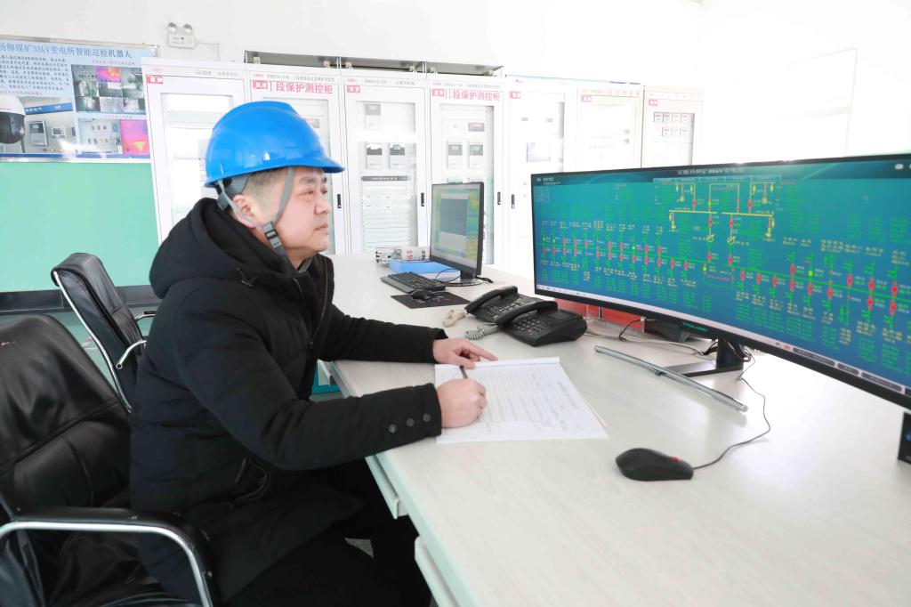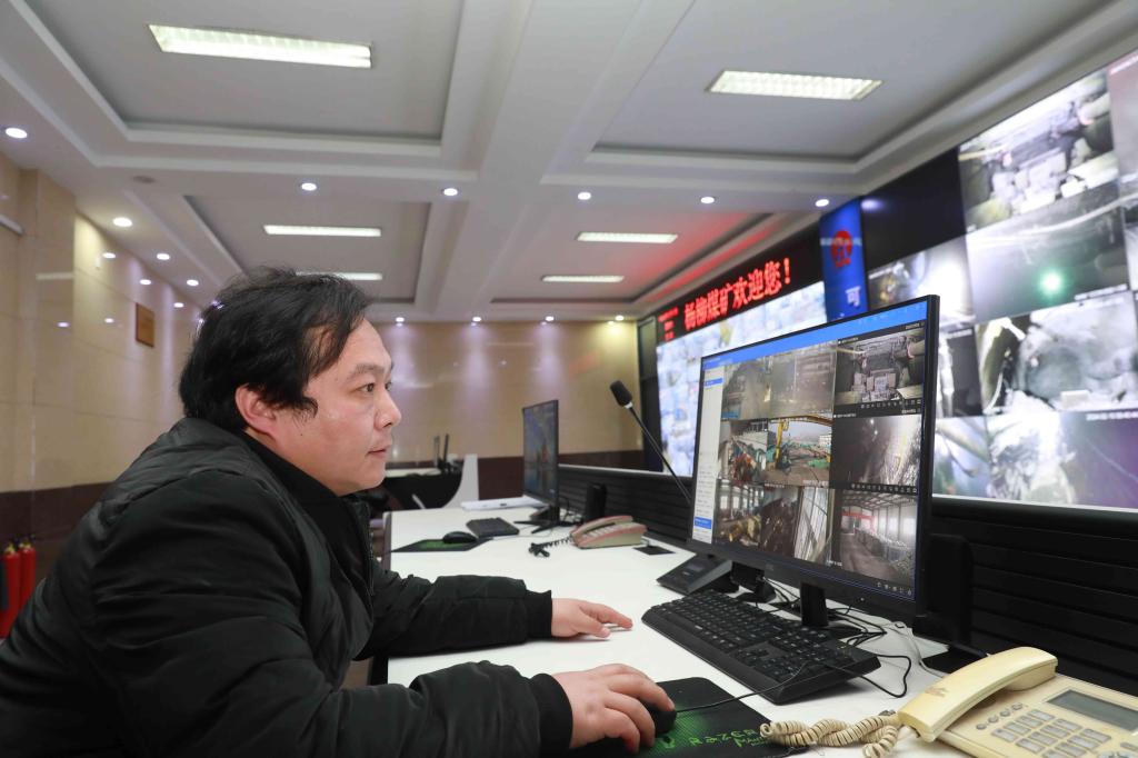 安監(jiān)處安檢員正在視頻監(jiān)控室排查井下各采掘頭面是否存在異常