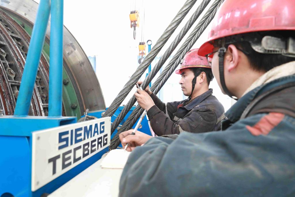 保運(yùn)一區(qū)運(yùn)轉(zhuǎn)隊(duì)機(jī)修班“師徒”趙偉、候利華二人正在認(rèn)真檢查記錄副井提升鋼絲繩繩徑和外觀情況