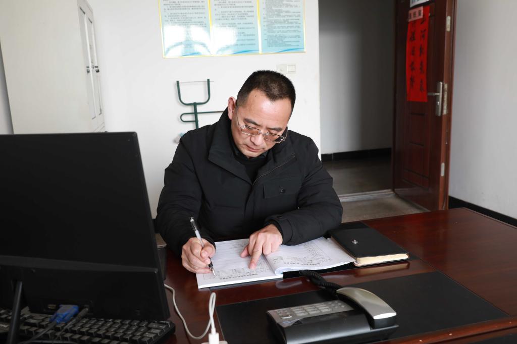 運(yùn)輸區(qū)值班副工長(zhǎng)吳義魁正在記錄井下電車(chē)司機(jī)匯報(bào)的發(fā)車(chē)情況