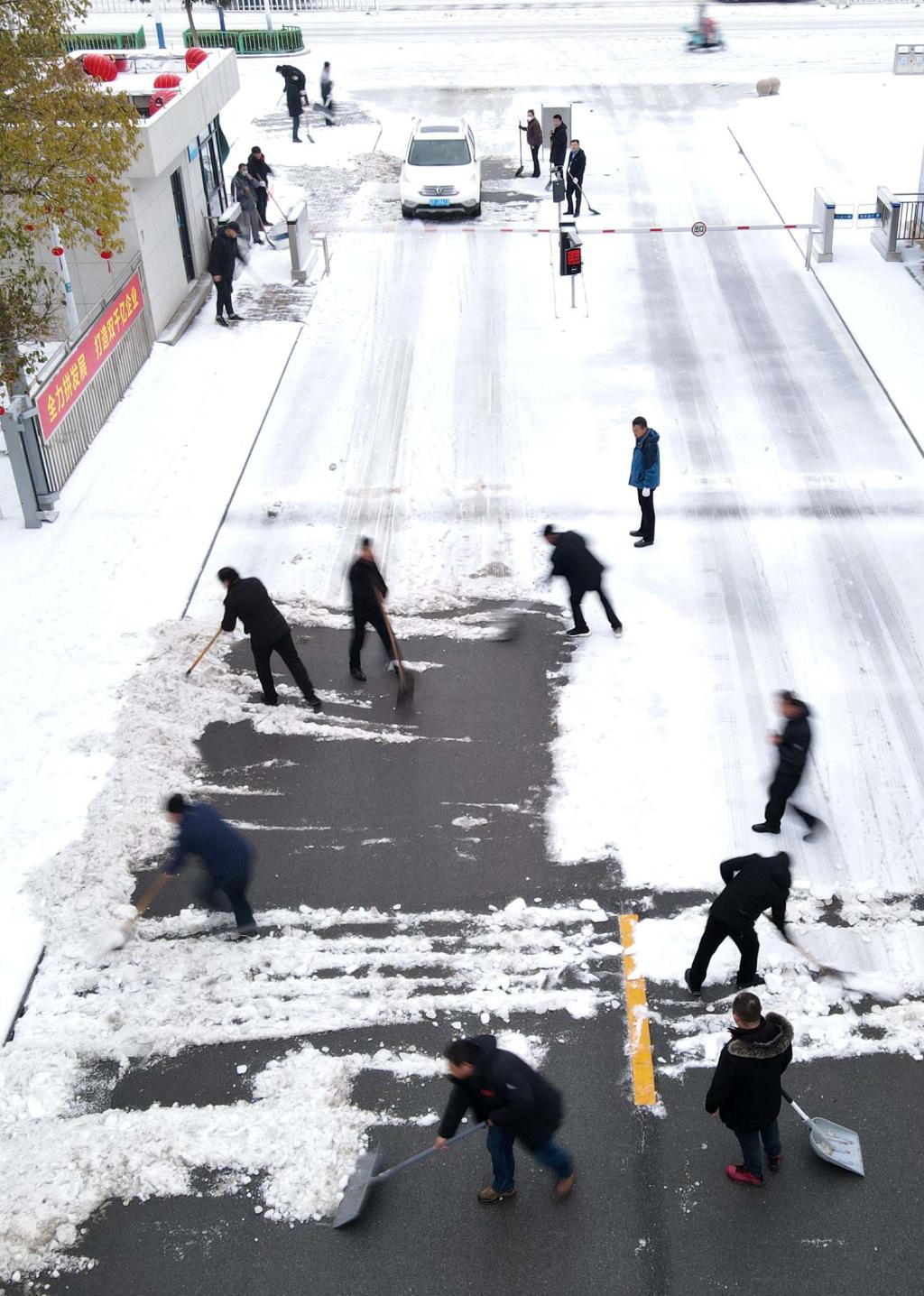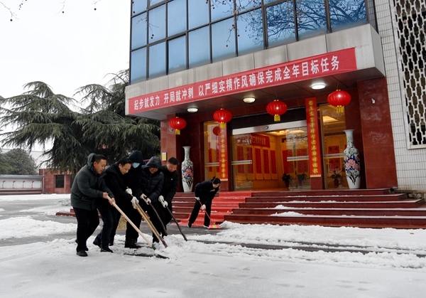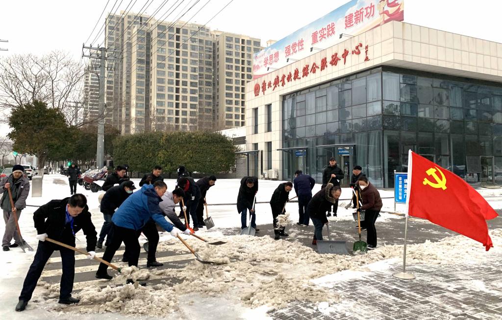 黨建引領(lǐng)戰(zhàn)風(fēng)雪。下午15時,趁雪勢減弱,公司各部門、各單位黨員干部職工自發(fā)上陣,開展掃雪除冰活動,有的用掃帚掃除路面積雪、有的用鐵鍬鏟去地面冰層,不畏嚴(yán)寒、通力協(xié)作、配合默契,盡管雙手和臉頰都被凍得通紅,但并沒有消減大家清掃的熱情和效率,忙碌的場景、團結(jié)的力量,筑牢了一道堅實的“溫暖防線”。