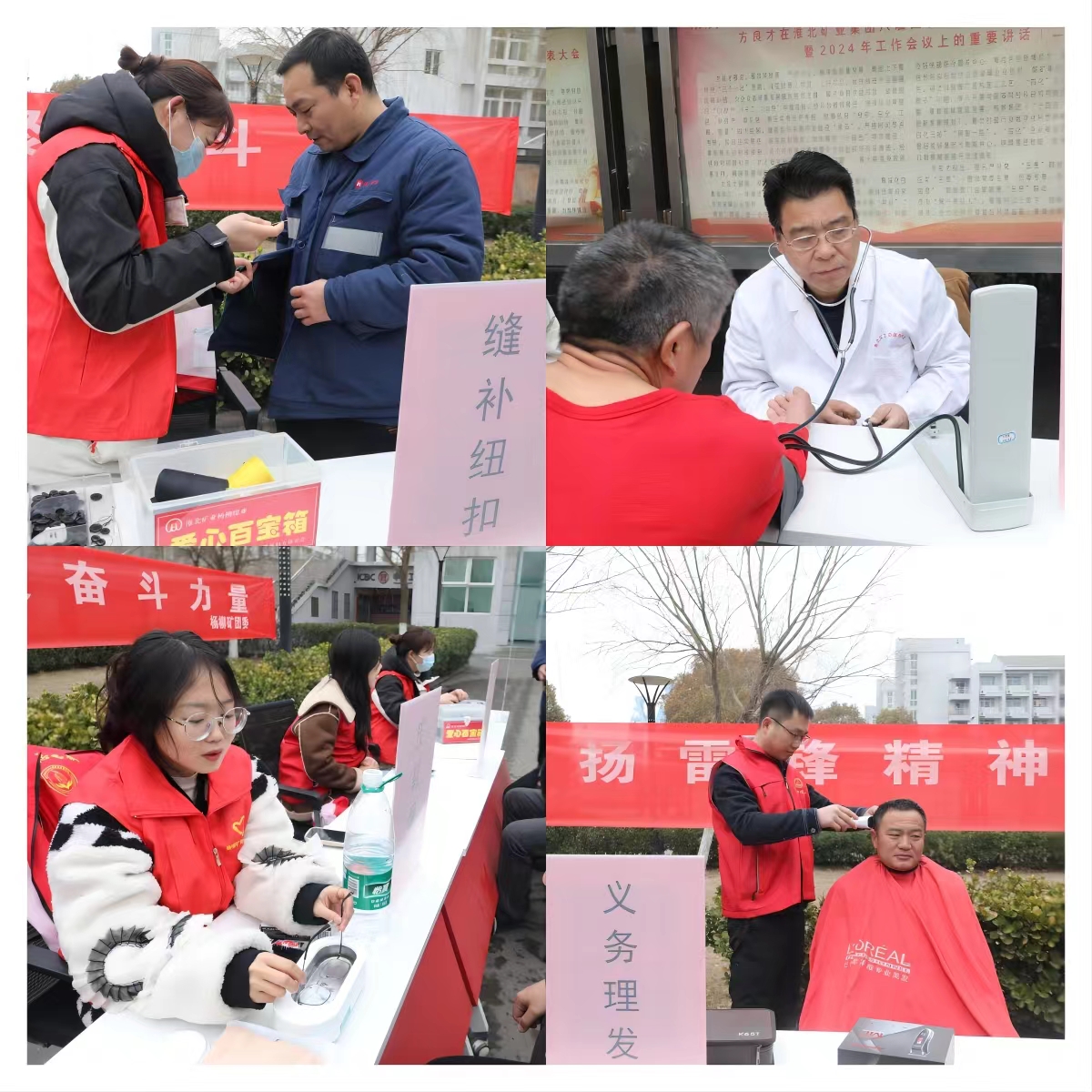 職工食堂門口,紅色的身影忙碌了起來。志愿者們擺好桌椅,拿出準(zhǔn)備好的剪刀、推子、血壓儀、紐扣針線、鞋油鞋刷、手機(jī)膜等物品,支起一個個愛心“小攤子”,熱火朝天地開啟了義務(wù)理發(fā)、血壓測量、手機(jī)貼膜、眼鏡清洗、縫補(bǔ)紐扣、皮鞋護(hù)理、政策解讀宣講等多項志愿服務(wù)活動。