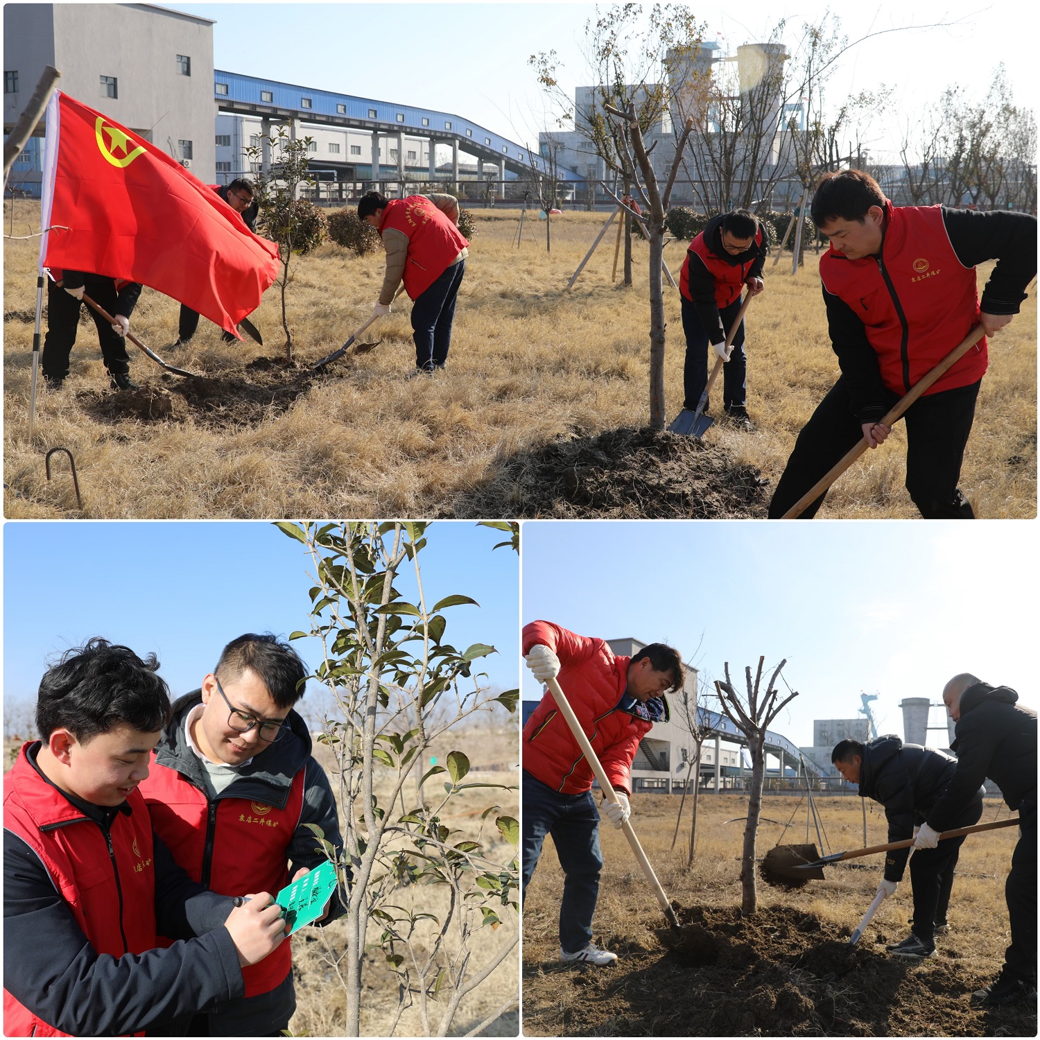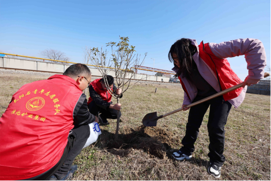 大家扛著鐵鍬、拿著樹苗、提著水管正在進行義務植樹活動?,F(xiàn)場分工明確、各司其職、配合默契,為共同建設我們的美好家園不遺余力,齊心協(xié)力栽種下一株株小樹苗,以實際行動為礦山增添了一抹濃濃的綠意。