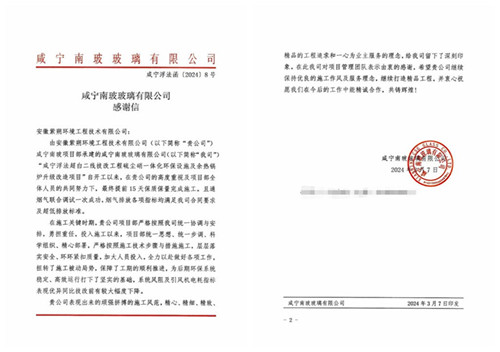 日前,紫朔環(huán)境公司再次收到咸寧南玻玻璃有限公司發(fā)來的感謝信。感謝該公司承建的咸寧浮法超白二線技改工程“工期提前15天,煙氣聯(lián)合調(diào)試一次成功且達到超低排放標準,系統(tǒng)風阻及引風機電耗指標表現(xiàn)優(yōu)異,同比技改前有較大幅度下降”。