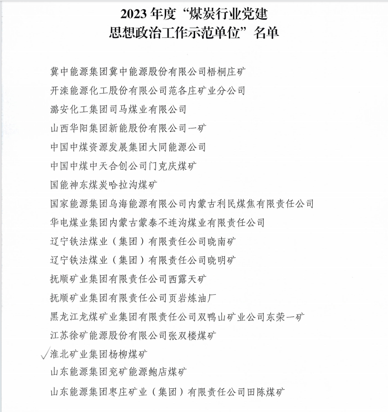 近日,中國煤炭職工思想政治工作研究會(huì)印發(fā)《關(guān)于命名2023年度“煤炭行業(yè)黨建思想政治工作示范單位”的通知》(中煤政研〔2024〕9號(hào)),楊柳煤礦榮獲2023年度“煤炭行業(yè)黨建思想政治工作示范單位”稱號(hào)。