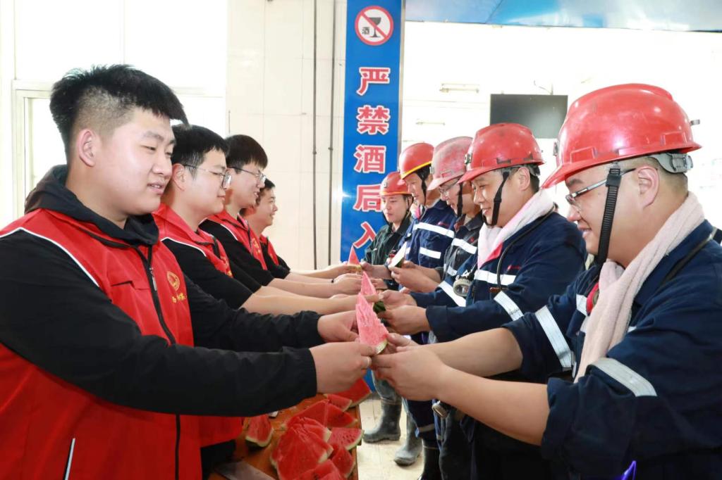 “師傅們,工作辛苦了!吃塊西瓜!”楊柳礦井口大廳,青年志愿者拿起清甜可口的西瓜遞給來往的職工。
