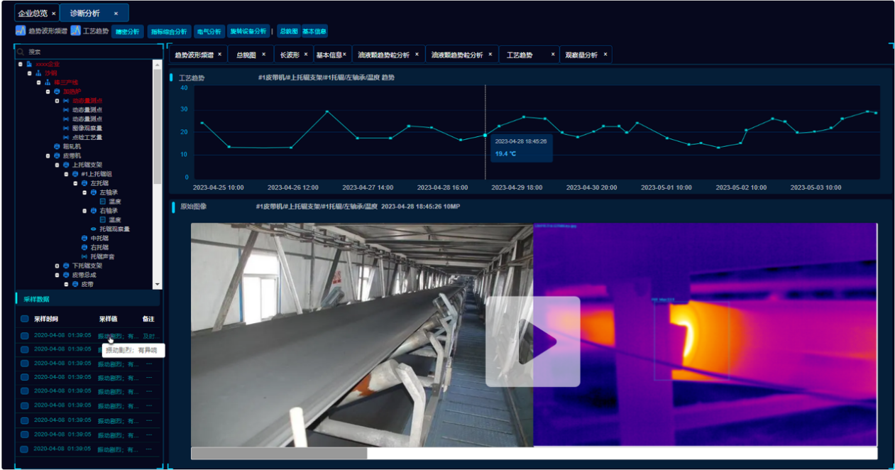 該廠原煤、精煤皮帶運輸機通過智能巡檢機器人動態(tài)巡檢、定點視頻實時監(jiān)測、振溫在線監(jiān)測、皮帶縱撕專項監(jiān)測多位一體,形成振溫、視頻、圖像、熱像、聲音、氣體等多元化監(jiān)測。50+AI算法模型部署,部件級故障智能報警,全故障診斷分析,完成周期性皮帶狀態(tài)巡檢、關(guān)鍵部位24小時監(jiān)測、異常及時識別和遠程狀態(tài)掌控,并通過多種采集設(shè)備內(nèi)部的邊緣智能算法,進行異常狀態(tài)聯(lián)動控制,可實時監(jiān)測托輥異常、皮帶跑偏、皮帶撕裂、筒皮變形等關(guān)鍵問題,真正實現(xiàn)無人化巡檢。