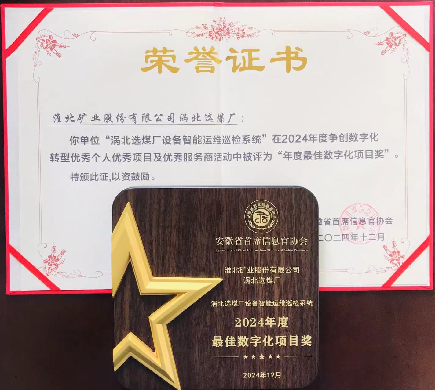 日前,渦北選煤廠設(shè)備智能運(yùn)維巡檢系統(tǒng)成功斬獲安徽省首席信息官協(xié)會頒發(fā)的“年度最佳數(shù)字化項目獎”,彰顯了渦北選煤廠在智能化、數(shù)字化創(chuàng)新領(lǐng)域取得的卓越成績。
