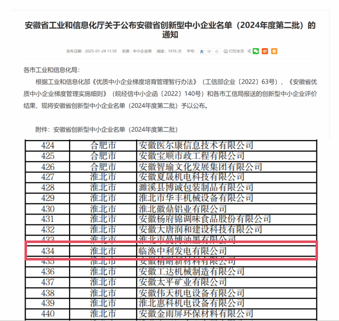 近日,安徽省工業(yè)和信息化廳公布2024年度第二批安徽省創(chuàng)新型中小企業(yè)名單,中利發(fā)電公司光榮上榜。