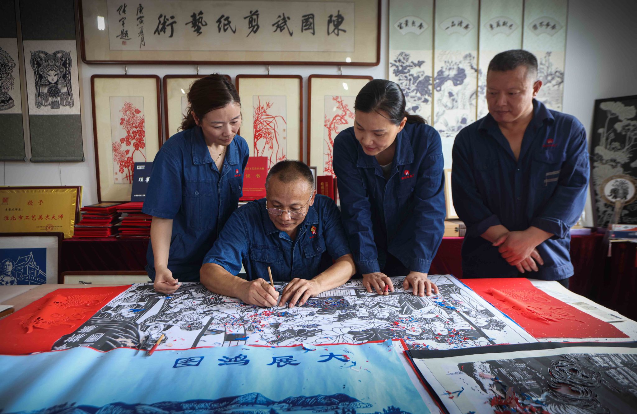 “陳大師技藝精湛,多年來(lái)他堅(jiān)持將黨的豐功偉績(jī)、祖國(guó)巨大變化融入剪紙。2024年國(guó)慶前夕,他帶領(lǐng)學(xué)生完成的《實(shí)干興邦》剪紙長(zhǎng)卷,以其磅礴的氣勢(shì)和精巧的構(gòu)思,成為紅色剪紙藝術(shù)的代表作?!痹搹S剪紙愛(ài)好者、物業(yè)公司黨支部書(shū)記朱麗說(shuō)道。